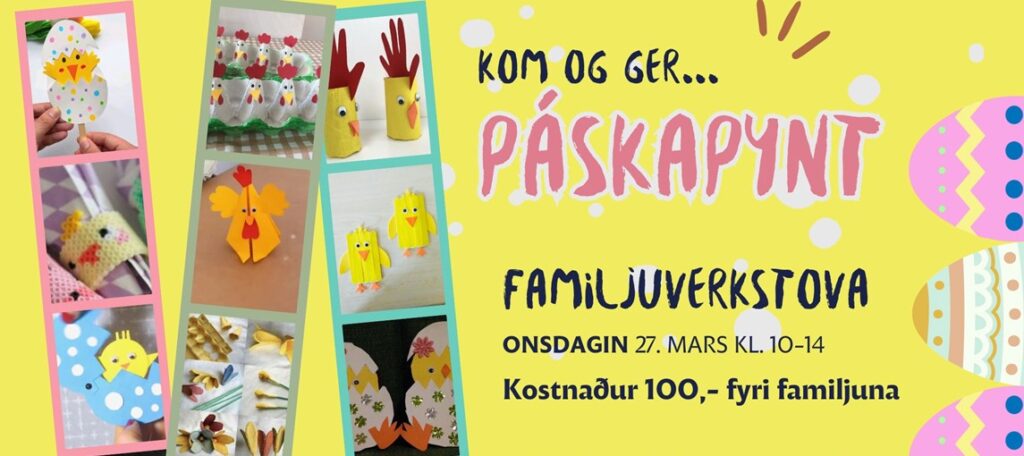 Kom og ger Páskapynt 14/03/2024 Familjuverkstova í Fablab Vágur. Onsdagin 27.mars kl. 10-14. Melda til á fablab@vagur.fo ella á Facebook innan 25.mars.